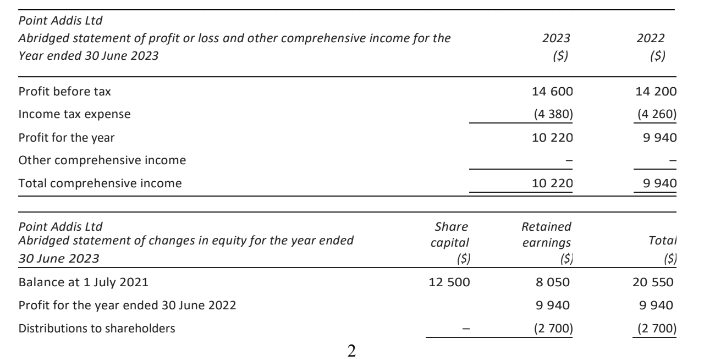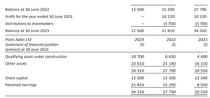 During 2020, Point Add is Ltd commenced the construction of a wind farm for its own use.During the reporting period ending 30 June 2023, a change in accounting standards means that the directors are required to change the company’s treatment of borrowing costs incurred in the construction of assets for its own use. In previous periods Point Add is Ltd expensed such costs but must now capitalise them as part of the construction cost in line with the requirement of AASB 123. The un adjusted statement of profit or loss and other comprehensive income and statement of changes in equity for the reporting period ended 30 June 2023 are detailed below.