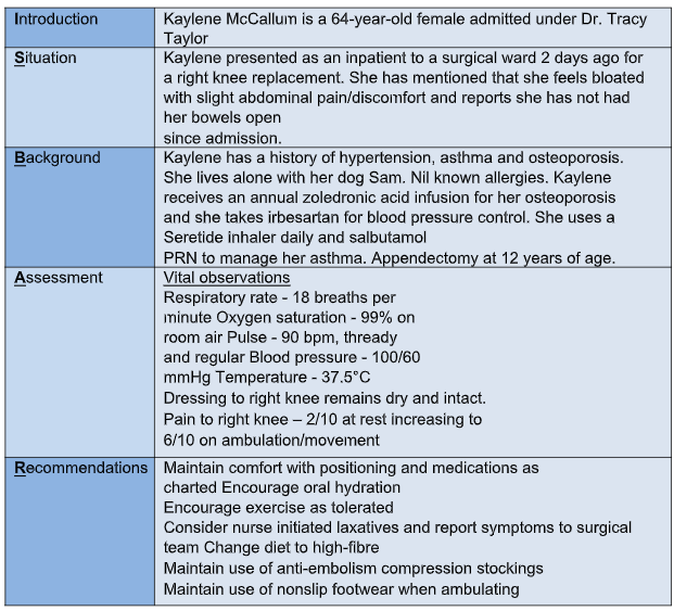 Today you are looking after Kaylene, who is two days post-surgery. She is reporting bloating, generalised abdominal pain and mentions she has not used her bowels since the operation. Your facilitator explains that Kaylene may be experiencing constipation.