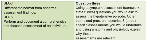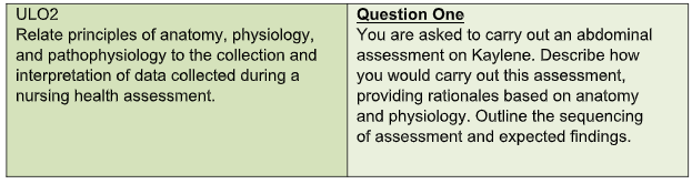 The purpose of this assessment task is to provide you with the opportunity to engage with key knowledge and skills drawn from each of the five Unit Learning Outcomes (ULOs) paying particular attention to ULO one two and three.This will allow you to demonstrate your ability to use this knowledge to organise and explain assessment findings using principles of anatomy physiology and pathophysiology and health assessment frame works. Completing this task will assist you to engage with and to demonstrate attainment of key knowledge and skills.