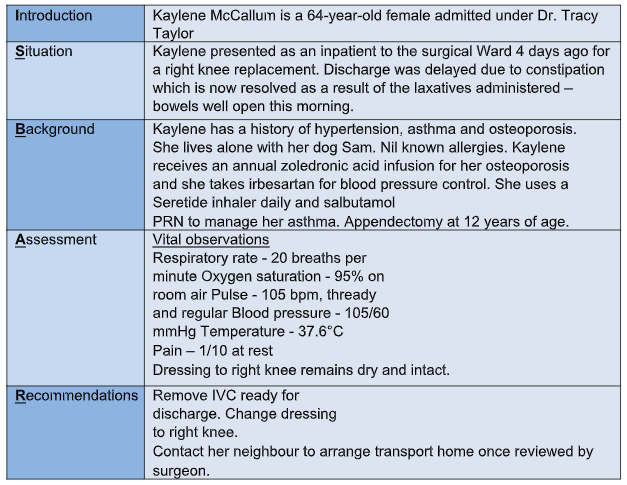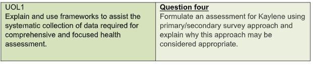 You arrived at clinical placement for an AM shift and Kaylene has been allocated as one of your patients. Your facilitator asks you to assess Kaylene to assist in the planning of her care.