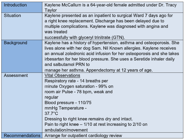 Week Three – Focus: Cardiac Assessment Shift to shift Handover